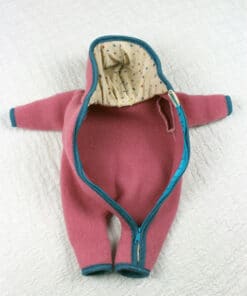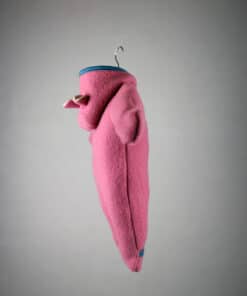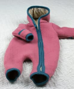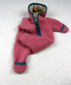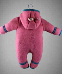 Dieser Baby-Overall aus Walk mit einem Kapuzenfutter aus Wolle/Seide hat die Farbe rosa. Die Materialkombination macht ihn zu etwas ganz Besonderem.